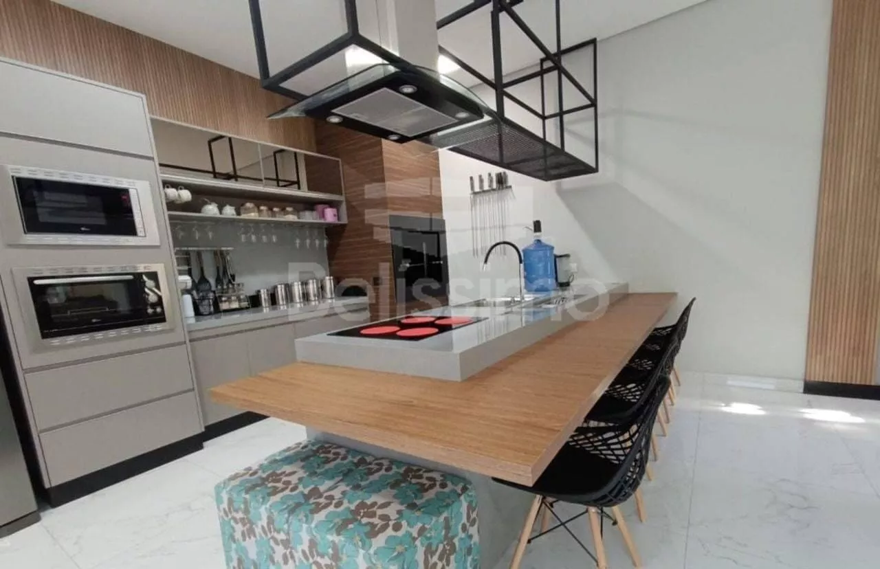 ▶️Cozinha Gourmet com armário contendo 12 portas planejadas, ilha com calha úmida com divisórias embutidas para louça, lixeira, porta esponja, porta detergente, cuba com capacidade para 50 litros tudo em aço inox escovado, bancada de MDF 6m para refeições ao entorno da ilha, paneleiro suspenso, churrasqueira de mármore, grelha inox, 6 espetos inox, exaustor para contenção de odores